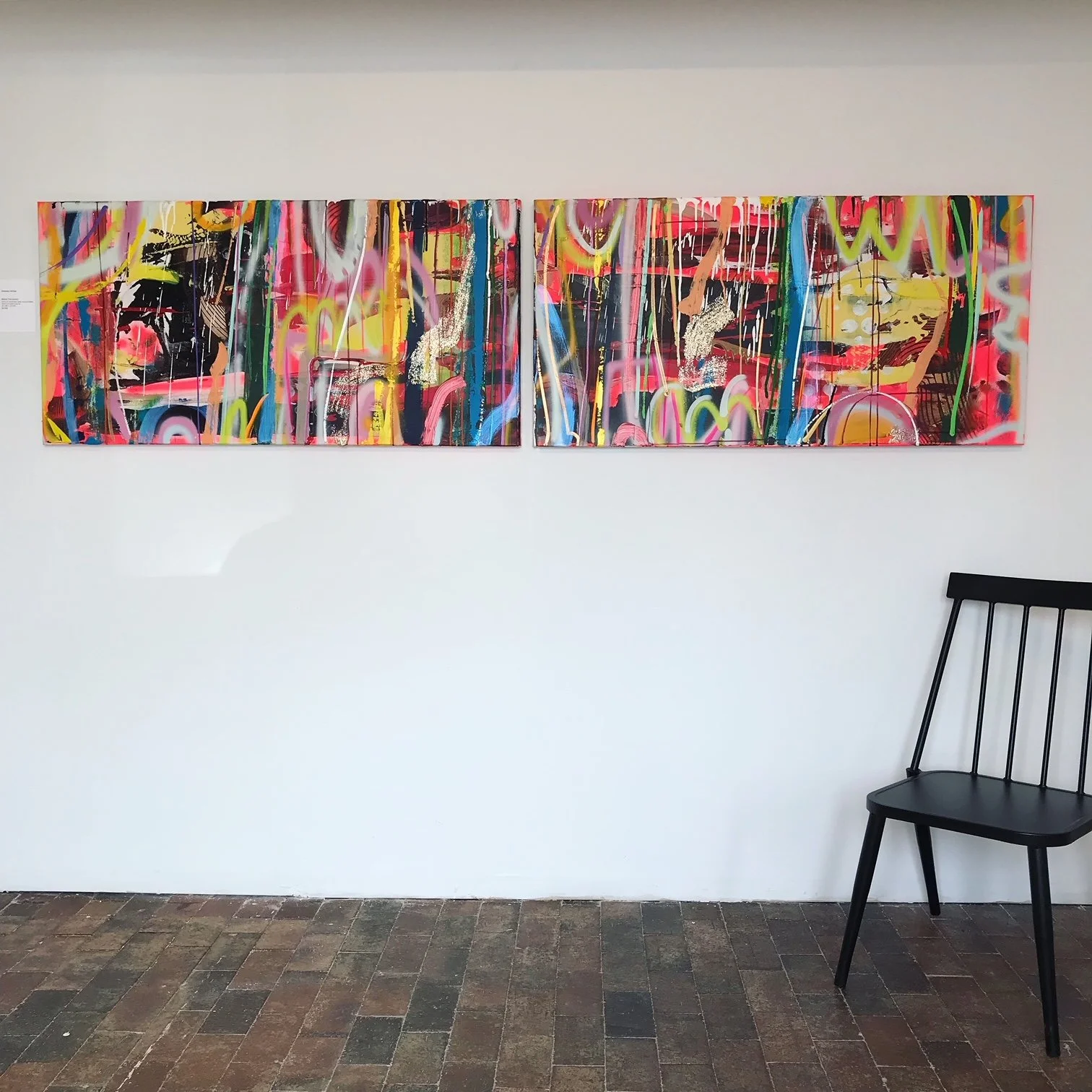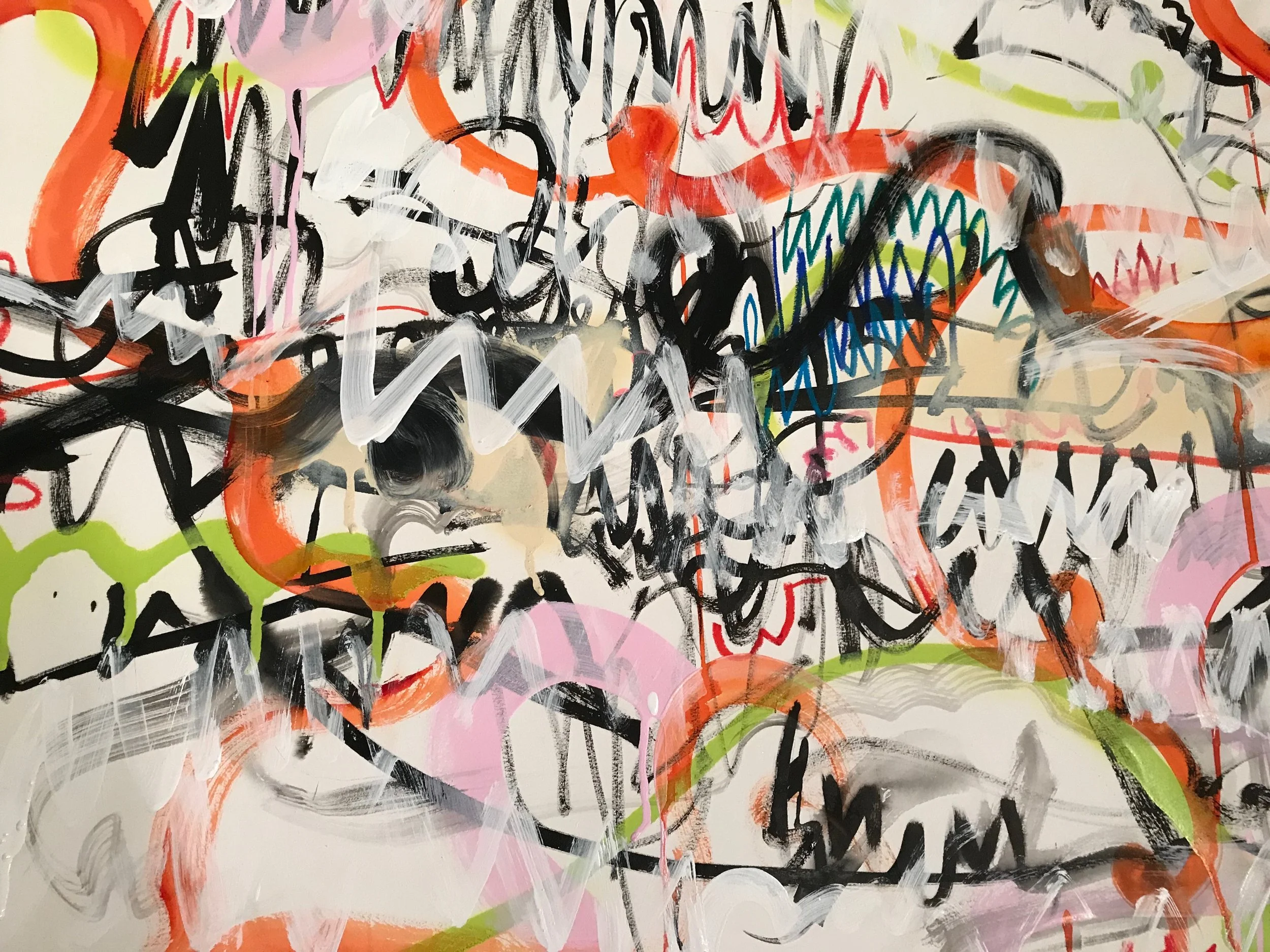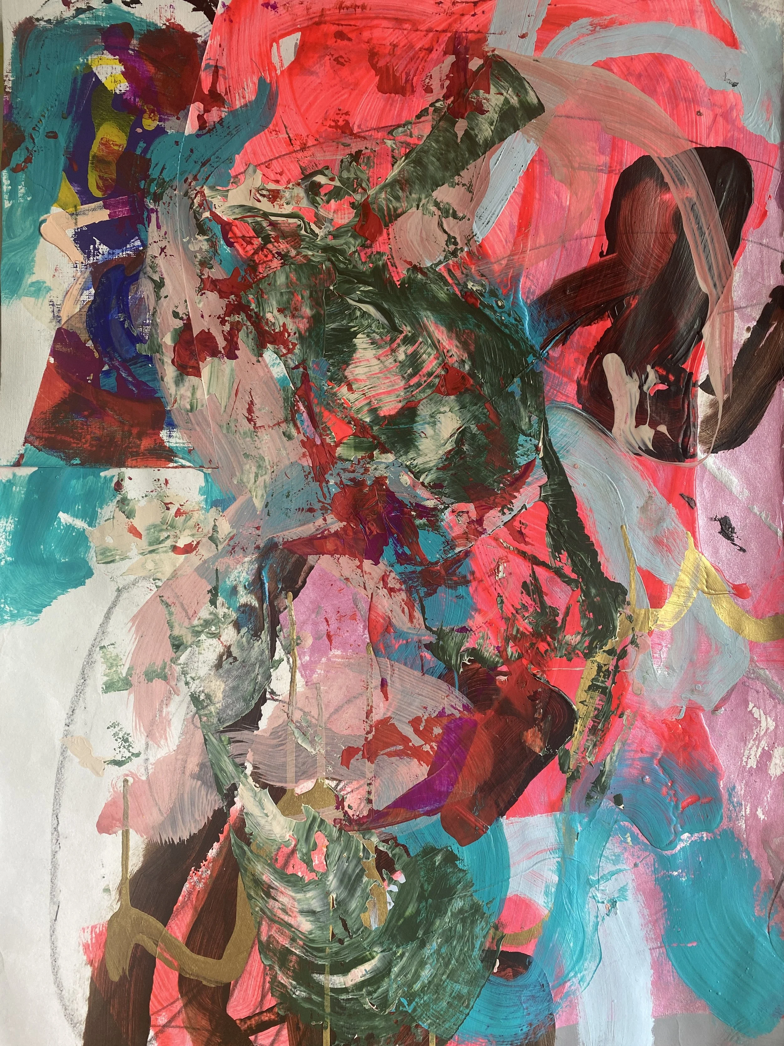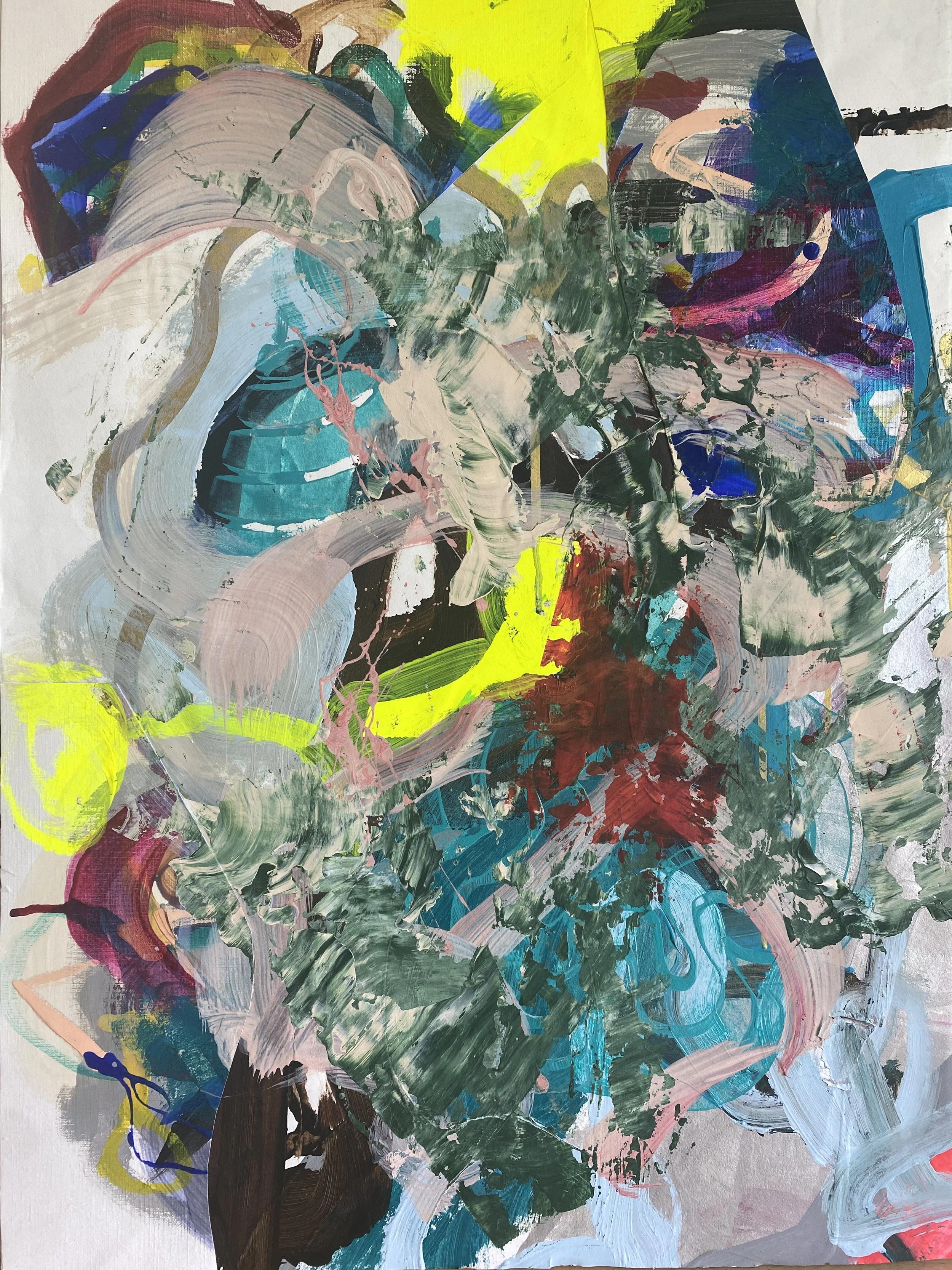 Wrobel calls this stage of out output "reactionary expressionism," which they have defined as: “work that is moved by the moment, often a catalogue of recorded actions input into the canvas.” They begin each artwork with words or select phrases and from their selected readings and then with each mark, they create an underpainting that moves and reacts to layering of colors and materials used in the moment. This fluidity creates depth and coded meaning in their work and the layering itself is symbolic of the complexities of identity and lived experiences.Wrobel's artistic practice extends to community work which has taken many forms over the years. They have organized art critique groups, managed art studios and hosted LGBTQ+ events and more. They currently live in Portland, OR with their partner, dog and sixty-some plants and flowers.